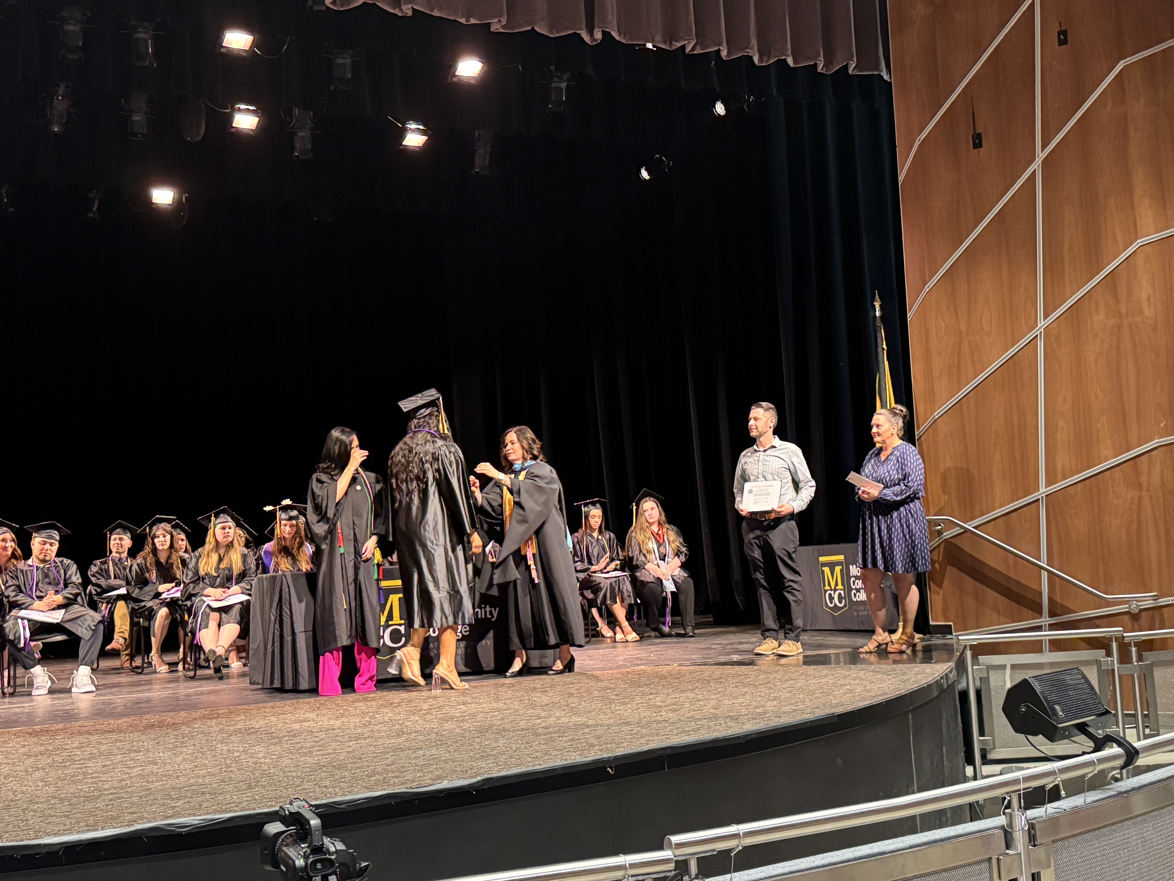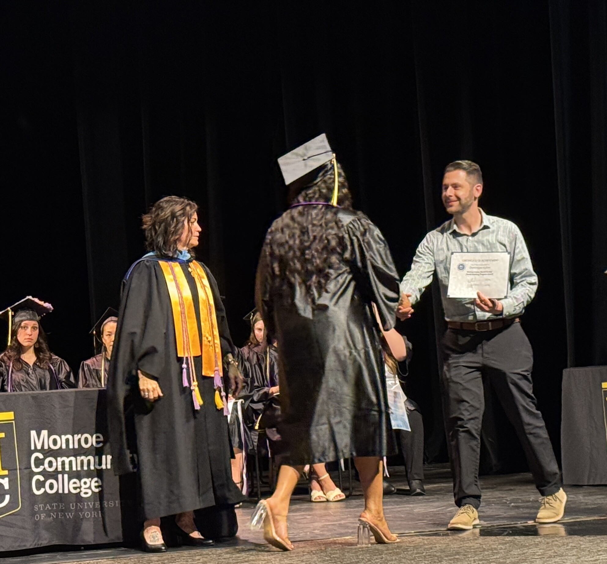 Dr. Taylor Squires, Monroe County Dental Society President, and Ms. Andrea Hughes, Administrative Communication / Event Manager, presented two awards during Monroe Community College’s Dental Studies Program Pinning Ceremony held on May 28, 2025. Two graduates received a certificate and monetary award for dental hygiene and dental assisting. Congratulations to these deserving students!