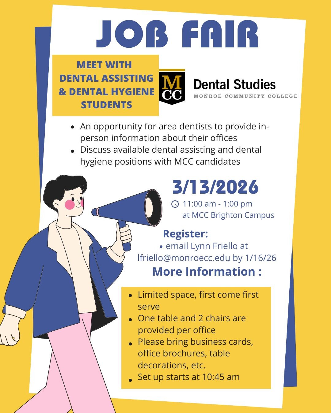 2026 MCC Dental Studies Job Fair When Mar 13, 2026 11:00 AM - 1:00 PM Where MCC Brighton Campus Contact lfriello@monroecc.edu